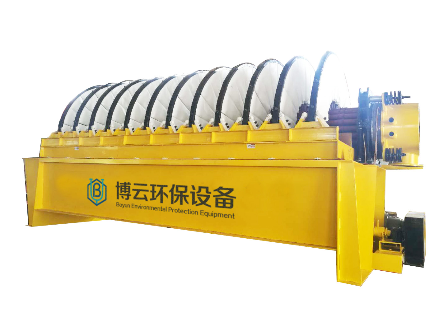 PG系列盤式真空過濾機 (1)扇形濾板脫水孔分布均勻,孔率合理,筋條尺寸大,由高強度工程塑料制成,壽命提高了2-3倍。 (2)濾液管過濾數面大,分配頭腹腔容積大,提高了抽氣率和濾液排放效果。 (3)耐磨錦綸、單或復絲濾布使脫餅率高且不易堵塞,使用壽命長。 (4)多點干油泵集中多點自動潤滑。 (5)濾布自動清洗裝置,保持了其良好的脫水效果。 (6)臥式強制高速攪拌、軸端采用橡膠及石墨盤根和水壓差三重密封不漏漿。 (7)主傳動無級變速,依物料的濃度及流量調節(交流調速電機或變頻器),以求達到理想的工作效果 。 (8)每盤由20片扇形板組成,加強了過濾過程控制,成餅厚度均勻。 (9)磨擦片采用特制耐磨硼鑄鐵,剛柔相濟密封佳,使用壽命達到十年以上。 (10)濾液管為高強度耐磨陶瓷復合鋼管,提高壽命10倍以上。 (11)濾液管與濾扇接口去掉下法蘭,采取模具定位直接焊接,減少了90%可能的漏氣點。