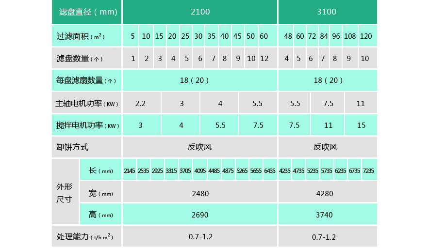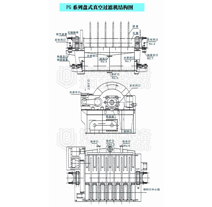 PG系列盤式真空過(guò)濾機(jī) (1)扇形濾板脫水孔分布均勻,孔率合理,筋條尺寸大,由高強(qiáng)度工程塑料制成,壽命提高了2-3倍。 (2)濾液管過(guò)濾數(shù)面大,分配頭腹腔容積大,提高了抽氣率和濾液排放效果。 (3)耐磨錦綸、單或復(fù)絲濾布使脫餅率高且不易堵塞,使用壽命長(zhǎng)。 (4)多點(diǎn)干油泵集中多點(diǎn)自動(dòng)潤(rùn)滑。 (5)濾布自動(dòng)清洗裝置,保持了其良好的脫水效果。 (6)臥式強(qiáng)制高速攪拌、軸端采用橡膠及石墨盤根和水壓差三重密封不漏漿。 (7)主傳動(dòng)無(wú)級(jí)變速,依物料的濃度及流量調(diào)節(jié)(交流調(diào)速電機(jī)或變頻器),以求達(dá)到理想的工作效果 。 (8)每盤由20片扇形板組成,加強(qiáng)了過(guò)濾過(guò)程控制,成餅厚度均勻。 (9)磨擦片采用特制耐磨硼鑄鐵,剛?cè)嵯酀?jì)密封佳,使用壽命達(dá)到十年以上。 (10)濾液管為高強(qiáng)度耐磨陶瓷復(fù)合鋼管,提高壽命10倍以上。 (11)濾液管與濾扇接口去掉下法蘭,采取模具定位直接焊接,減少了90%可能的漏氣點(diǎn)。