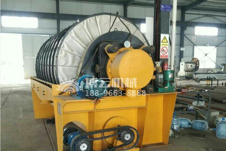 盤式真空過濾機由各個單獨的扇形片的圓盤構成。每一個扇形片為單獨的過濾單元,由濾布做成布套在扇形片上形成濾室。過濾盤由電機通過減速器及開式齒輪傳動來驅動,過濾盤順時針方向轉動,濾室里的礦漿在吸附區借助于真空泵在過濾介質兩側形成的壓力差,附著在過濾盤上形成濾餅后,攪拌器旋轉防止固體沉淀,濾餅離開液面后,在真空作用下繼續脫去水分。濾液透過濾布,經過濾液管,從分配頭排出。濾餅在卸料區由反吹風卸料落入排料槽,整個作業過程連續循環進行。
