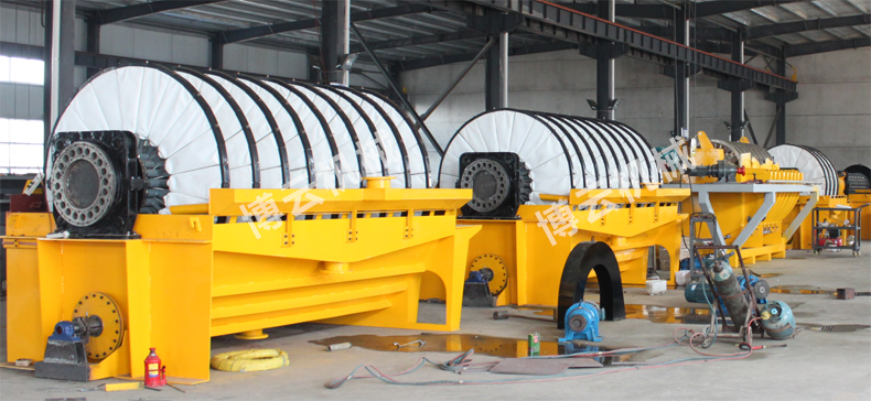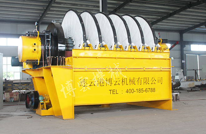 盤式真空過濾機由各個單獨的扇形片的圓盤構成。每一個扇形片為單獨的過濾單元,由濾布做成布套在扇形片上形成濾室。過濾盤由電機通過減速器及開式齒輪傳動來驅動,過濾盤順時針方向轉動,濾室里的礦漿在吸附區借助于真空泵在過濾介質兩側形成的壓力差,附著在過濾盤上形成濾餅后,攪拌器旋轉防止固體沉淀,濾餅離開液面后,在真空作用下繼續脫去水分。濾液透過濾布,經過濾液管,從分配頭排出。濾餅在卸料區由反吹風卸料落入排料槽,整個作業過程連續循環進行。